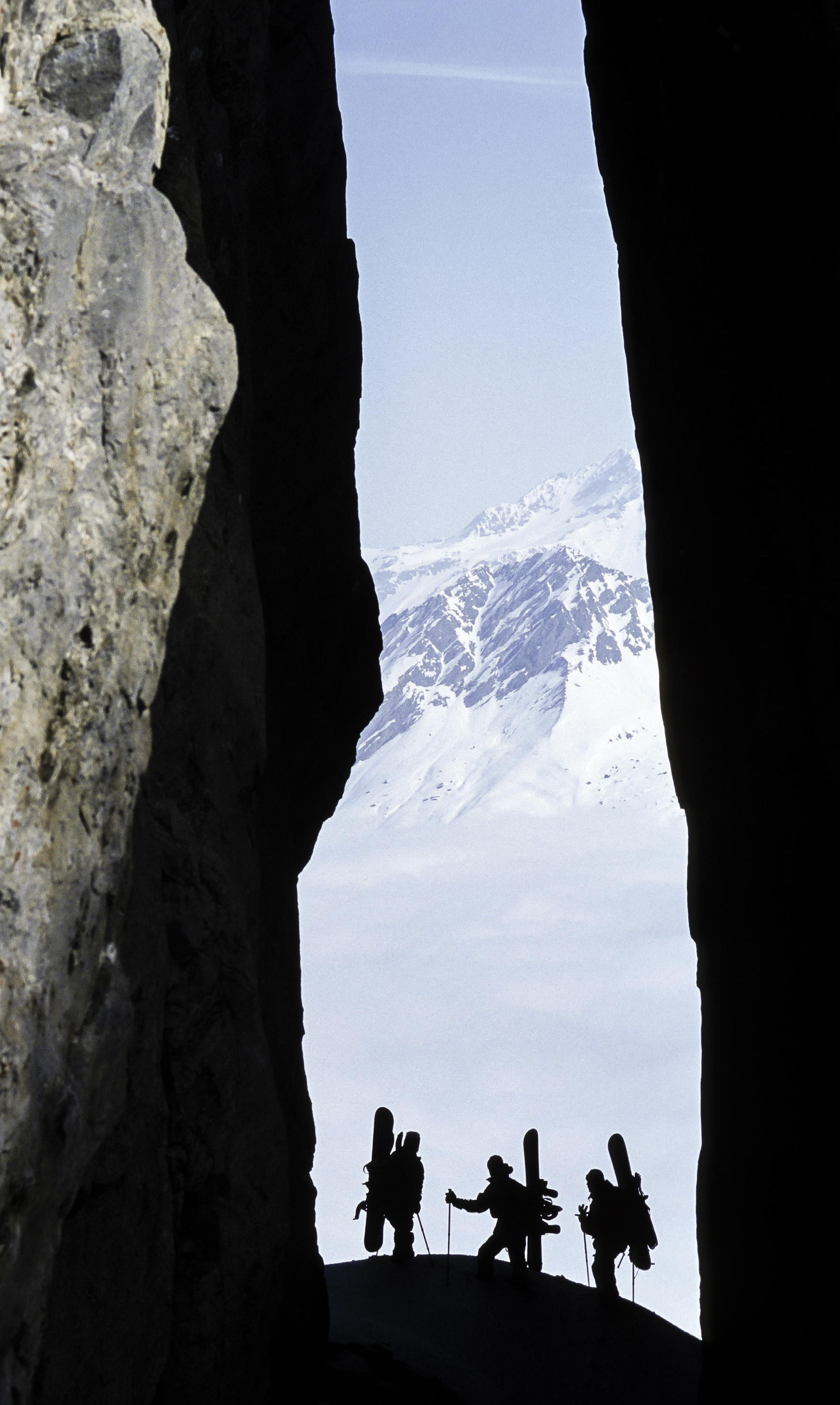 Alors, pour une version courte de l’itinéraire, on peut partir de Courchevel direction La Saulire, et prendre le télésiège de Chanrossa au sommet duquel on quitte le domaine skiable pour s’engager sur le versant opposé dans la Vallée des Avals, passer par le refuge des Lacs Merlet et descendre jusqu’au Grand Plan. Coller les peaux pour attaquer la première montée au Rocher de Plassa d’où l’on redescend pour se placer à l’aplomb de la Brèche de la Portetta, en direction de laquelle on monte à nouveau d’abord en peaux, puis à pied, skis sur le sac car la pente se redresse sévèrement. C’est le prix à payer pour accéder à cet incroyable univers aux airs de Dolomites, cheminer dans l’étroit passage entre ces hautes parois et basculer de l’autre côté pour une descente vertigineuse dans l’un des deux principaux couloirs qui s’offrent à nous.