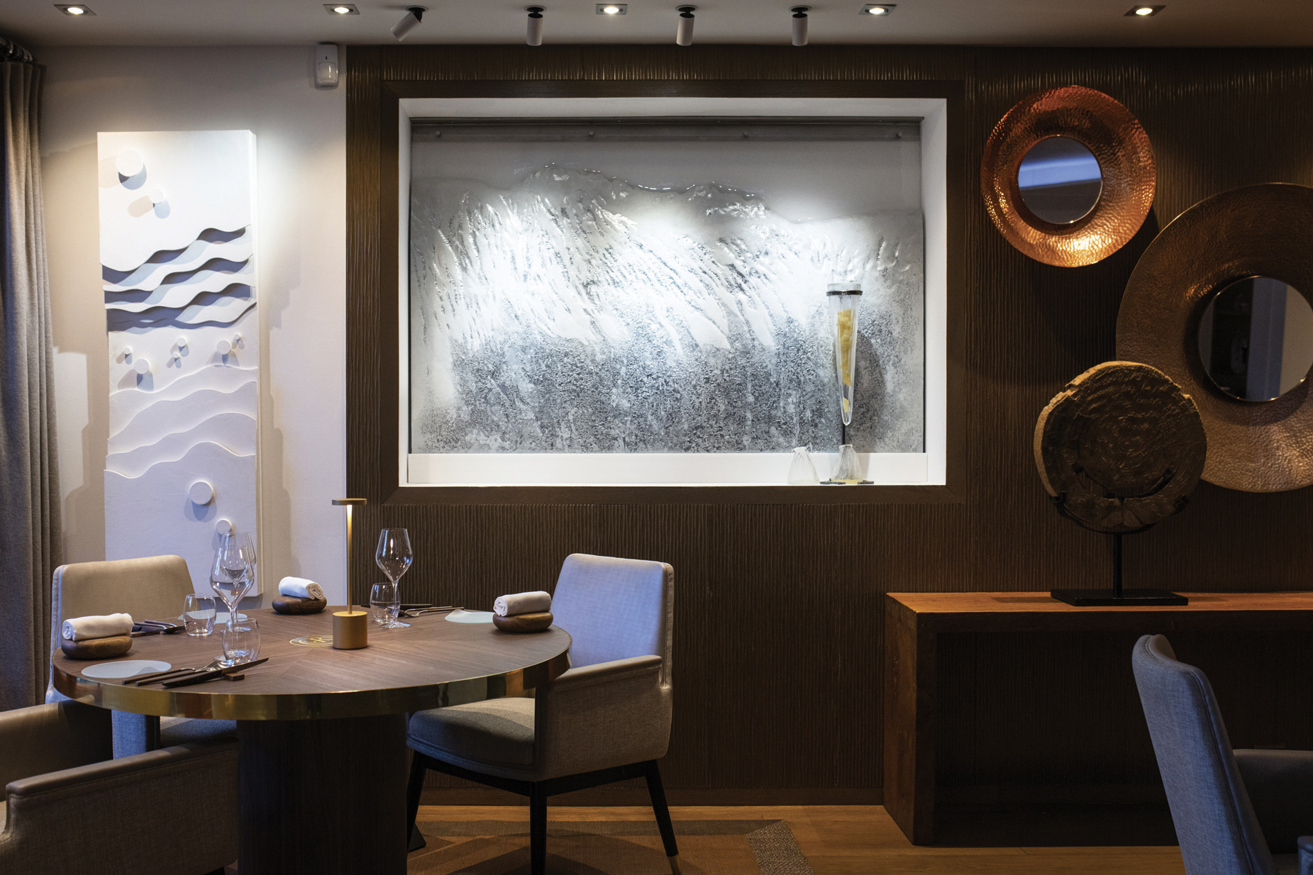 At the two-Michelin-starred BAUMANIÈRE 1850 restaurant at the Le Strato in Courchevel, the Stalactite stands as a living work of art. This glass sculpture contains a cryo-concentration of mountain herbs and French kiwi, imagined by pastry chef Martin Cassier. Presented tableside, it slowly transforms, melting throughout the meal into a sauce boat, like a natural stalactite shaped by time. At the end of dinner, guests can savour the elixir thus created.