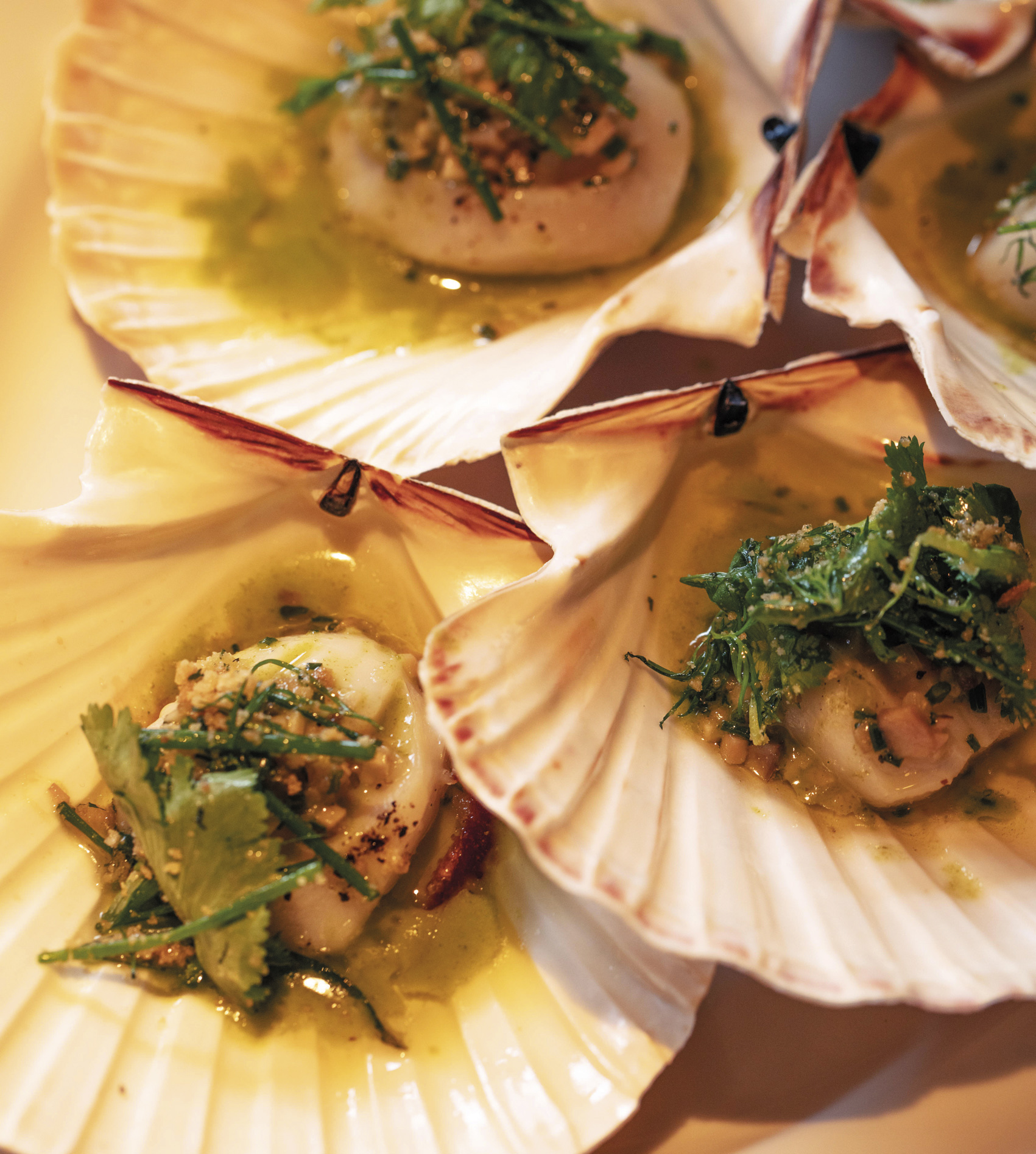 Imaginé par le Chef Exécutif Benoît Dargère, ce plat reflète l’équilibre subtil entre raffinement italien et tradition alpine propres à Loulou Courchevel. Rôties au beurre demi-sel, les noix de Saint-Jacques dévoilent une texture fondante et un goût délicat, sublimé par une sauce à la livèche et à la Chartreuse verte, à la touche aromatique anisée. La vierge de champignons, ajoute une profondeur terreuse et croquante, contrastant avec la douceur des Saint-Jacques. Un zeste de citron équilibre les saveurs par sa fraîcheur acidulée. L’association de différentes huiles évoque avec élégance la gastronomie piémontaise. Accompagné d’un Bourgogne Blanc Saint-Aubin Premier Cru 2022 d’Antoine Jobard, ce plat offre une expérience gustative chaleureuse et sophistiquée.