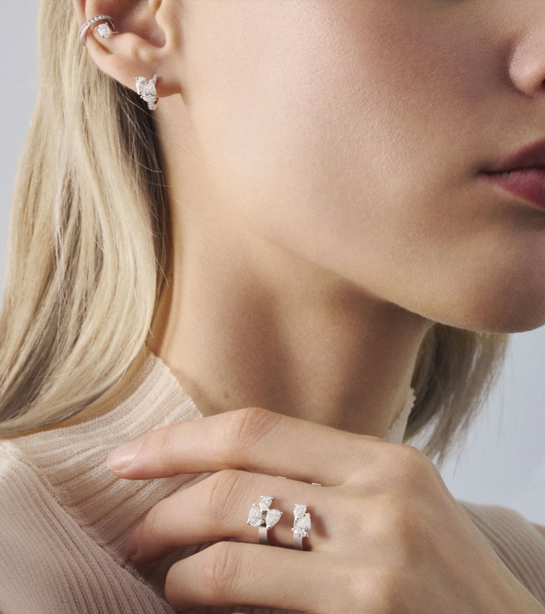 The exceptional craftsmanship of this renowned jewelry Maison creates an illusion of levitation, enhancing the natural brilliance of its iconic pear-cut diamonds. Born from a shared avant-garde vision between Alberto Repossi and his daughter Gaia, Serti sur Vide boldly reimagines the classic solitaire.