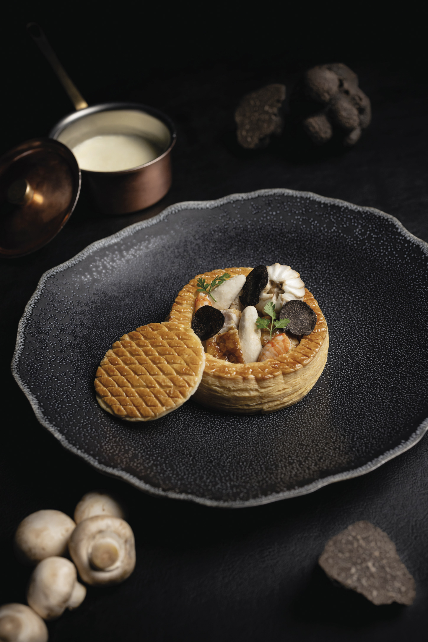 Guillaume Duchemin, Executive Chef of Le K2 Collections, and Davide Sessa, Executive Chef of K2 Altitude, present a delectable reinterpretation of the classic vol-au-vent.Crispy on the outside and tender on the inside, the sweetbreads are perfectly paired with crayfish, slices of farm-raised poultry, fine stuffing, and button mushrooms. In a delicate land-and-sea harmony, two distinct sauces—a poulette with Vin Jaune and a crayfish sauce infused with tagetes—bring elegance and complexity to the dish. Enhanced with truffles and paired with Chasselas sous Voile 2019 from Domaine « Les Vignes du Paradis, » carefully selected by Executive Head Sommelier Pierrick Fischer, this creation offers a noble and contemporary homage to French culinary tradition.